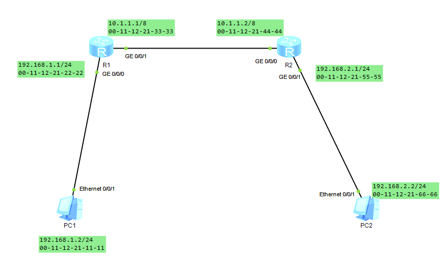 目前已知:PC1知道PC2的ip地址但不知道PC2的MAC地址。R1知道PC2的IP和MAC地址,R2知道PC1的IP地址和MAC地址。