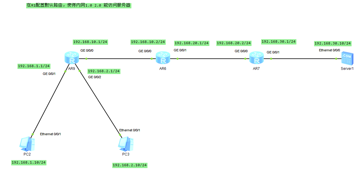 设置好后给AR9设置默认路由,给AR6,AR7设置静态路由,使得PC2PC3能访问服务器