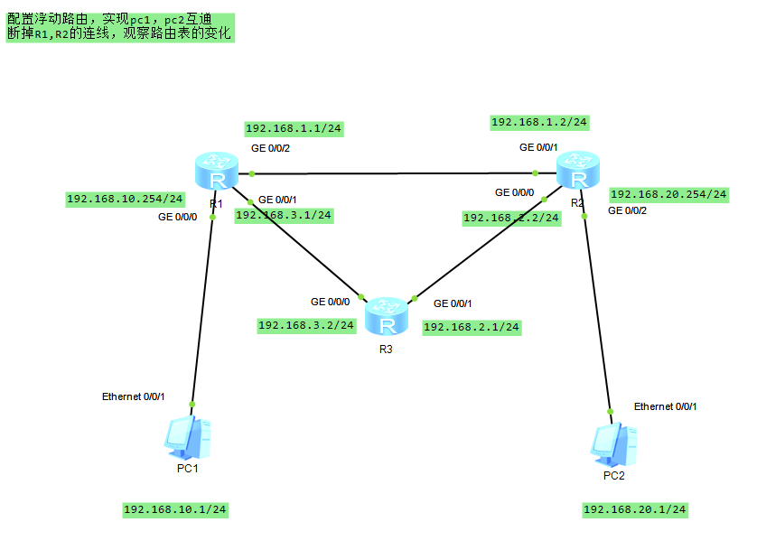 ```javascript[R3]ip route-static 192.168.10.1 24 192.168.1.1[R3]ip route-static 192.168.20.1 192.168.2.1