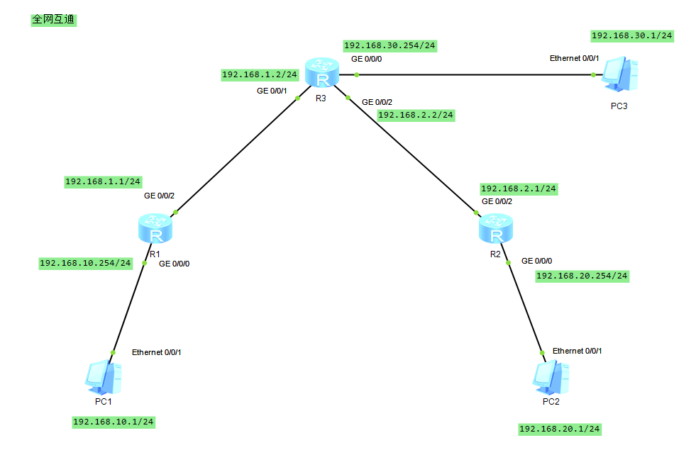 先给PC1PC2配上ip子网掩码和网关。R1,R2,R3每个接口配上ip和子网掩码。